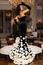 A strapless mermaid gown in velvet, fitted to perfection, with scatteRD roses gracefully embellishing the lower portion of the dress. This dress has high stretch.