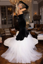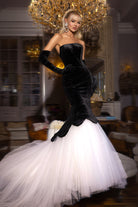 A strapless fitted velvet gown with a mermaid silhouette, complemented by a flowing tulle mermaid skirt. This dress has high stretch.