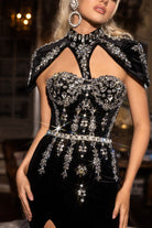 A fitted velvet gown featuring a beautifully beaded bodice and a removable cap shoulder sleeve adorned with intricate beading. This dress has medium stretch.