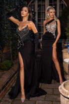 A strapless fitted gown with a beaded bodice, a striking beaded flower at the hip, and a high slit. This dress has no stretch.