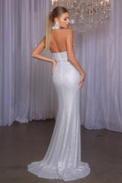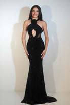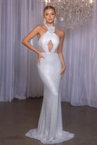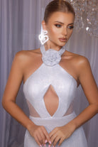 Sleek sophistication meets contemporary allure in style PS26020, a gown designed for unforgettable entrances. The halter neckline gathers into a chic rosette detail, framing a daring keyhole cut out that adds a modern twist to its timeless silhouette. Sheer side panels subtly accentuate the waist, while the fitted skirt glides elegantly into a soft train. Scattered with delicate sparkle, this gown captures the light beautifully, creating a look that?? both refined and alluring.?