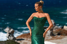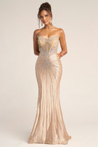 Style PS26250 embodies refined glamour with its strapless, body-contouring silhouette. The gown is intricately beaded in a radiant, sunburst pattern that enhances the natural curves and elongates the frame.