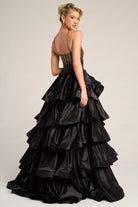 Style PS26253 captures playful elegance with its structured corset bodice and voluminous tiered skirt. The gown features delicate straps and a fitted waist that flows into cascading layers of glossy ruffles, creating dramatic movement with every step.