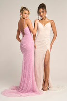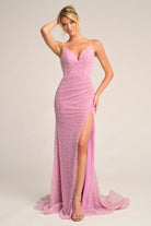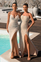 Style PS26265 captures effortless glamour with its fitted silhouette and all-over textured beadwork. The gown features a delicate sweetheart neckline with thin straps, complemented by a thigh-high slit that adds a touch of allure.