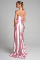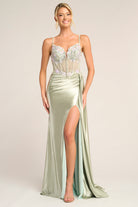 Style PS26270 blends modern elegance with delicate detail. The gown features a sheer corset bodice adorned with floral appliqu? and light bead accents, paired with slender straps for a feminine touch. A sleek satin skirt with a thigh-high slit and soft draping completes the look, creating a graceful and captivating silhouette.