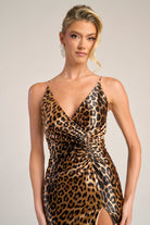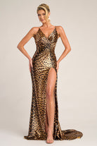 Style PS26276 embodies bold sophistication with its striking animal-print design. The gown features a fitted silhouette with a plunging V-neckline and gathered waist detail that enhances the figure. A daring thigh-high slit and subtle train complete the look, blending confidence and allure in perfect balance.