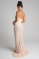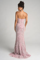 Style PS26277 captivates with its refined glamour and intricate bead artistry. The strapless gown features a fitted silhouette adorned with cascading hand-beaded patterns that shimmer with every movement. A thigh-high slit adds a touch of allure, while the structured design elongates the figure, making it the perfect choice for an elegant statement look.