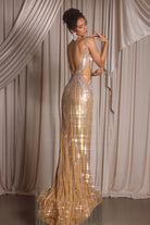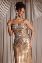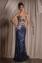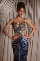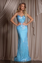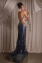 PS26405C delivers high-impact glamour with its sculpted beaded bodice and sleek, figure-accentuating silhouette. The gown features intricate linear beadwork placed to contour the waist and elongate the body, while the illusion cut-outs add a modern, sultry edge. The fitted skirt falls into a graceful sweep train, and the open back adds an element of allure from every angle. Finished with a thigh-high slit for ease of movement, this shimmering design is made for evening events where sophistication and confidence take center stage.