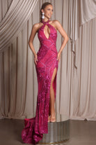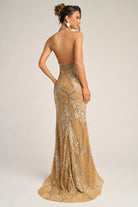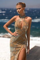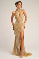 A striking gown that blends modern glamour with timeless sophistication, this halter-neck design features an elegant keyhole neckline and a figure-hugging silhouette that flatters from every angle. The intricate sequin pattern contours the body with shimmering lines and curves, culminating in a daring thigh-high slit that adds a seductive touch. The open back creates a dramatic finish, while the sweep train trails gracefully behind for a refined, show-stopping entrance.