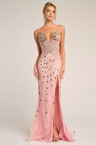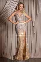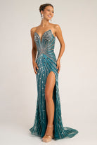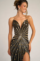 PS26409C captivates with radiant elegance, featuring a strapless sweetheart neckline adorned in shimmering beadwork that draws the eye to the d?colletage before sculpting seamlessly through the bodice for a flattering, cinched silhouette. Intricately beaded linear motifs cascade down the gown like streams of light, elongating the figure and creating a breathtaking, fluid effect from every angle. A thigh-high slit adds a refined touch of allure, offering graceful movement with each step, while the sweep train trails behind for an unforgettable, polished finish. Both glamorous and timeless, this gown is designed for the woman who wants to shine with sophistication and confidence at formal evening occasions.