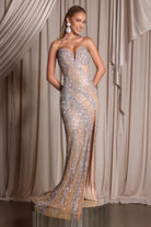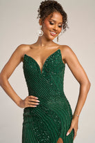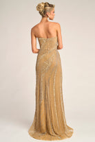 PS26410C delivers a show-stopping moment of glamour, designed to sculpt the figure with its radiant beadwork and dramatic detailing. The strapless sweetheart neckline enhances the d?colletage, flowing into a curve-hugging silhouette embellished with shimmering linear motifs that contour the body for a flattering hourglass effect. A thigh-high slit adds confidence and allure, while the sweeping floor-length skirt creates graceful movement with every step. Finished with a sparkling pattern that catches the light from every angle, this gown is the perfect choice for women who want sophistication, drama, and undeniable red-carpet presence.