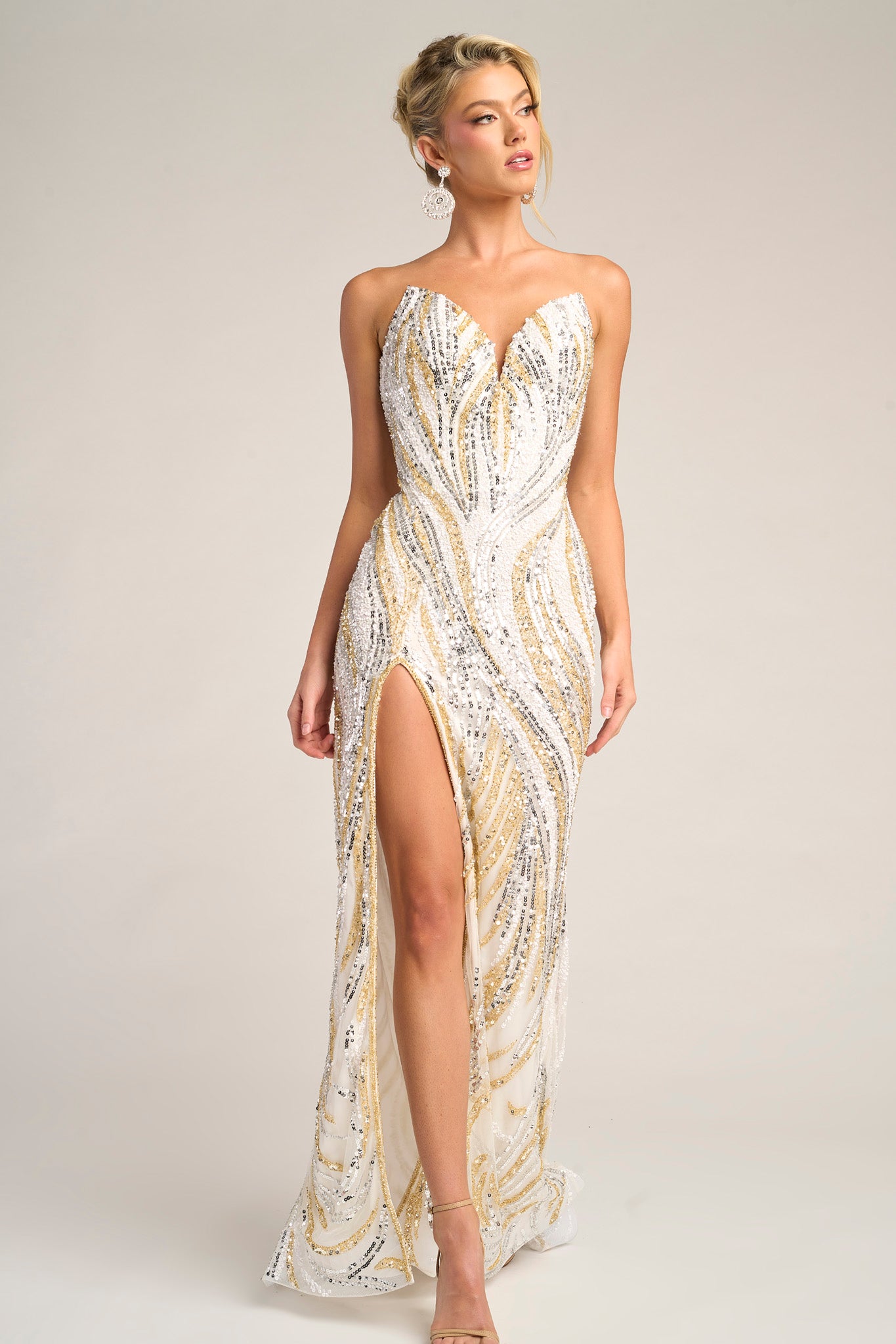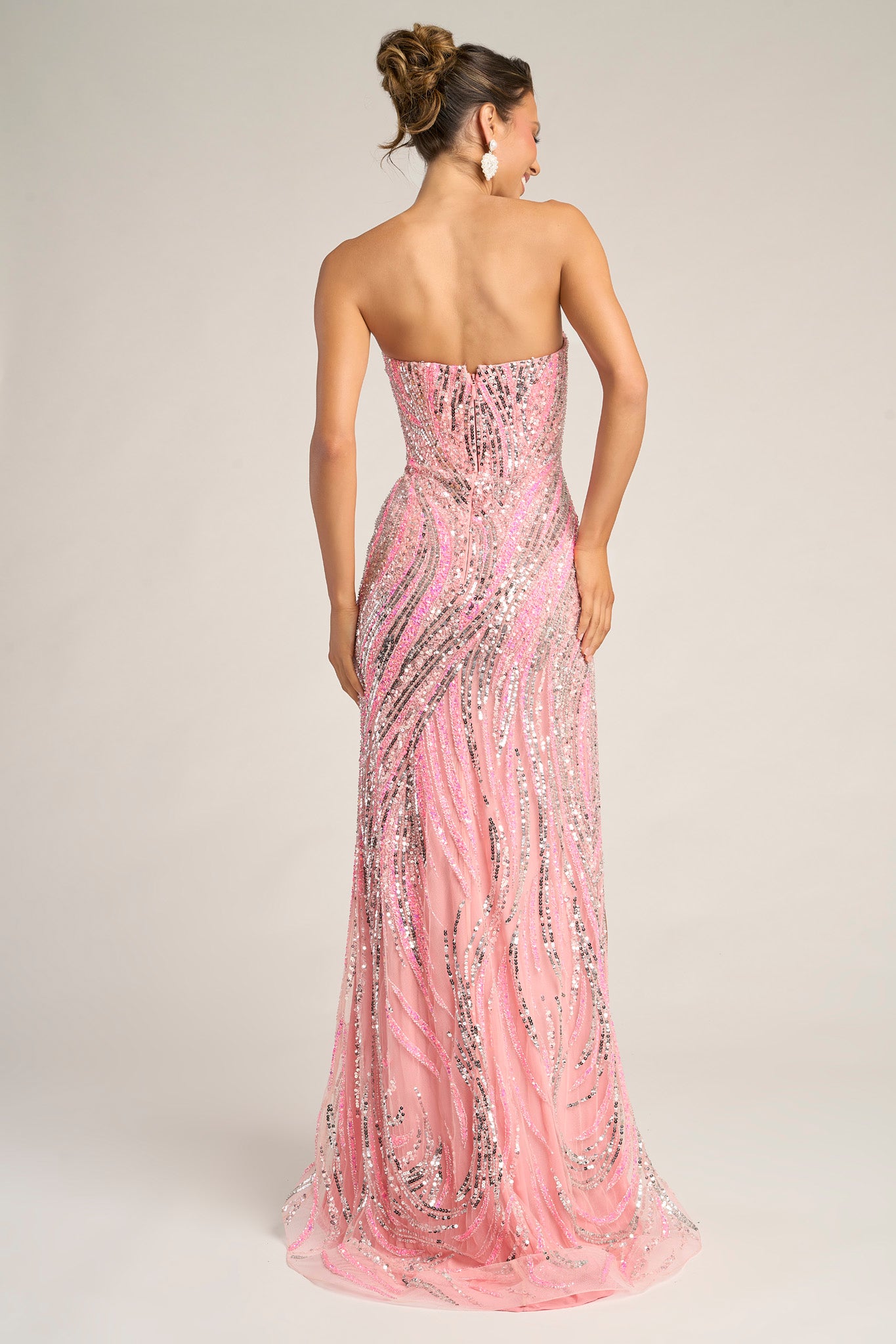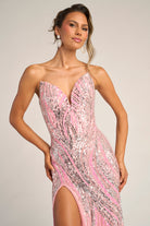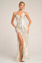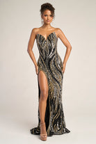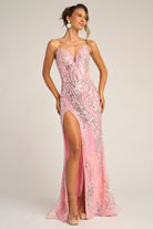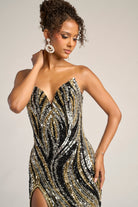 PS26419C radiates soft glamour and feminine grace, designed to captivate from every angle. The strapless sweetheart neckline flatters the d?colletage, while the fully beaded design shimmers with an intricate swirl pattern that enhances the natural curves of the body. The fitted silhouette glides seamlessly into a thigh-high slit, offering both movement and allure. Finished with a subtle sweep train, this gown perfectly balances sophistication and sensuality, making it an exquisite choice for evening occasions where elegance meets modern sparkle.