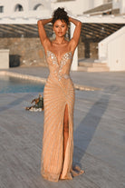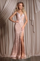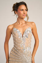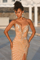 PS26422C showcases exquisite craftsmanship and timeless allure, blending intricate detail with a modern silhouette. The gown features a structured sweetheart neckline adorned with delicate floral appliqu? that softly trails onto the bodice. Radiating beadwork throughout the design enhances the feminine form, while the fitted silhouette and thigh-high slit bring a touch of sensuality. The back reveals a smooth, contouring finish that flatters from every angle, flowing into a sweep train that adds graceful movement. Elegant and captivating, this gown embodies sophisticated glamour perfect for any formal occasion.