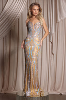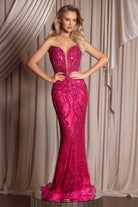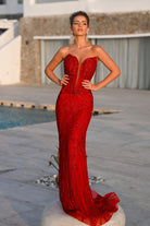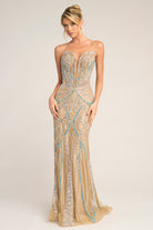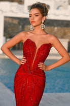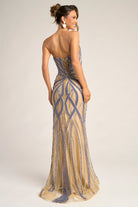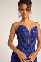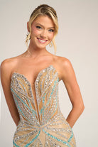 PS26423C is the epitome of bold sophistication, designed to command attention with every detail. This strapless gown features a sculpted plunge neckline accentuated by sheer illusion inset, creating a striking yet refined focal point. The fitted silhouette is embellished with intricate beadwork arranged in a flowing, art-deco-inspired pattern that contours the body and elongates the frame. Crafted from luxurious fabric that shimmers under the light, the gown hugs the figure before flaring slightly into a graceful sweep train. Effortlessly glamorous, this style delivers a perfect balance of drama and elegance for any red-carpet occasion.
