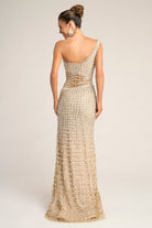 PS26434C redefines modern glamour with its asymmetric neckline and sleek, figure-hugging silhouette. The one-shoulder design features intricate crystal detailing that catches the light beautifully, while sheer cut-outs along the waist add a daring yet elegant edge. The column skirt falls effortlessly to the floor, creating a refined, elongated shape. A perfect choice for those wanting a sophisticated gown with subtle drama and high-impact sparkle.