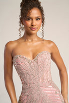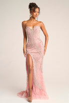 PS26435C channels sunset-inspired radiance with a strapless sweetheart neckline and a flawlessly tailored fit. Intricate beadwork radiates outward in a starburst pattern, enhancing the gown?? figure-hugging silhouette. The thigh-high slit adds a sultry touch, while the soft shimmer of the fabric catches the light with every movement. Both timeless and striking, this gown embodies red-carpet-worthy sophistication with a romantic, modern edge.
