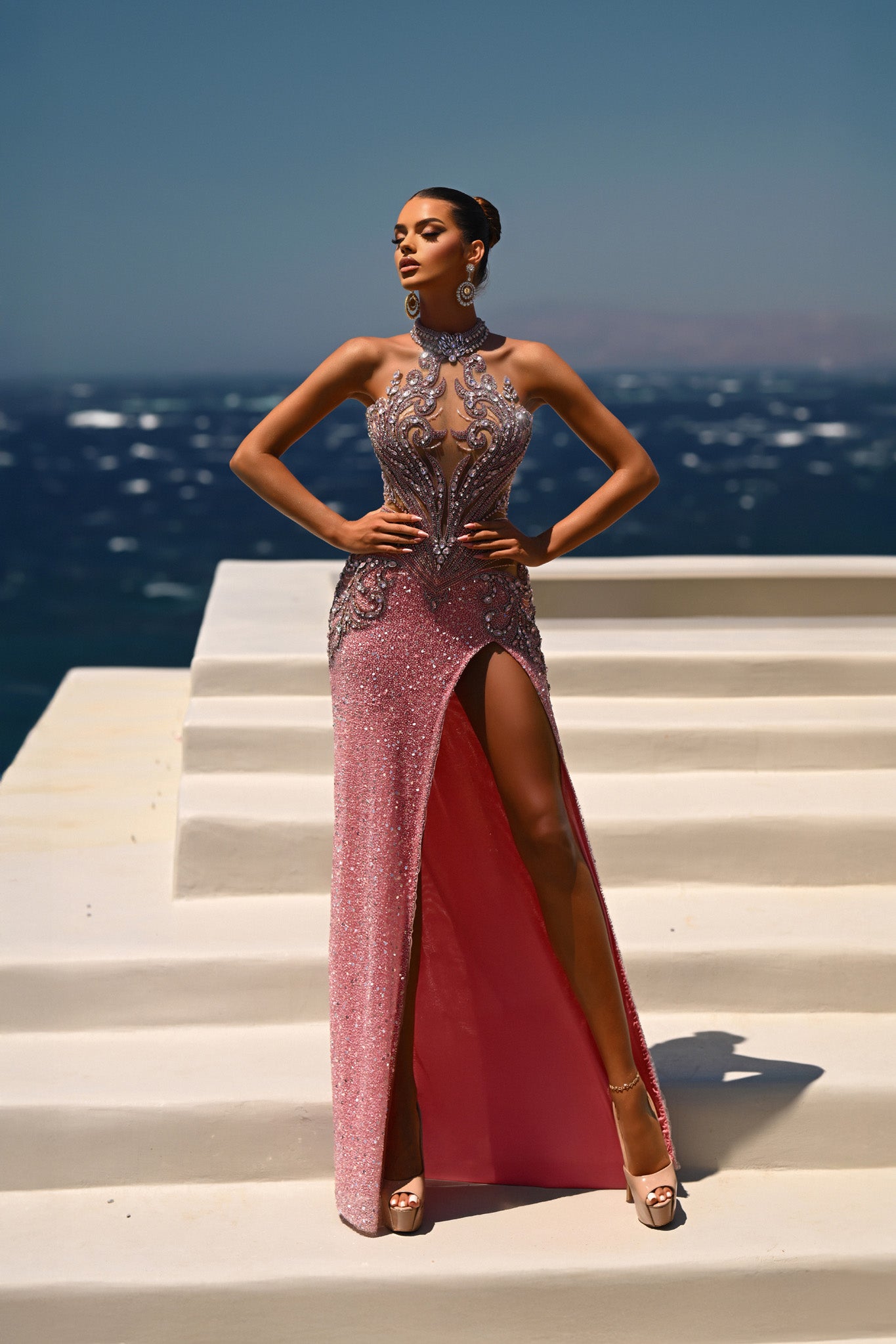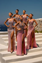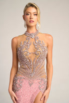 PS26436C is a vision of luxury and sophistication. The high illusion neckline and sheer bodice are adorned with intricate beadwork and embroidery that create a sculpted, corset-like effect. Flowing into a sleek fitted skirt with a daring thigh-high slit, the gown perfectly balances elegance and allure. Finished with a subtle shimmer and refined embellishments, this design captures timeless red-carpet glamour.