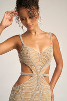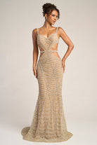 PS26455C perfectly balances sultry sophistication and modern elegance. This fitted gown showcases intricate linear beadwork that contours the body, while the curved side cutouts highlight the waist for a sculpted silhouette. Delicate straps and a low back add a touch of allure, making this style ideal for those seeking a statement look with refined glamour.