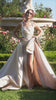A fitted gown featuring pearl and beaded straps, a dramatic bow at the hip, an overskirt, and a high slit. This dress has medium stretch.