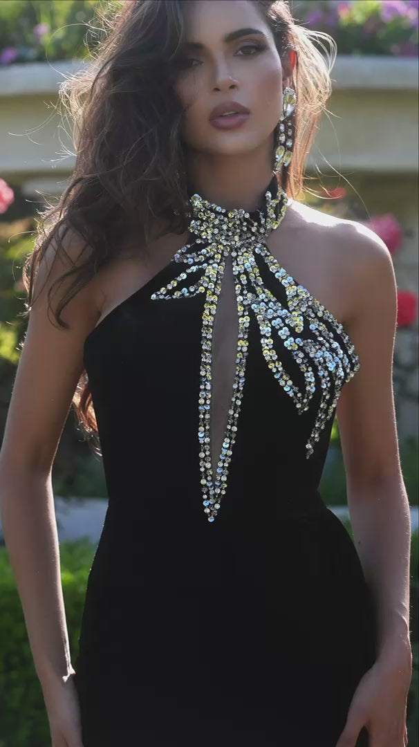 A high-neck velvet fitted gown adorned with beading along the keyhole and neckline, featuring a high slit. This dress has medium stretch.