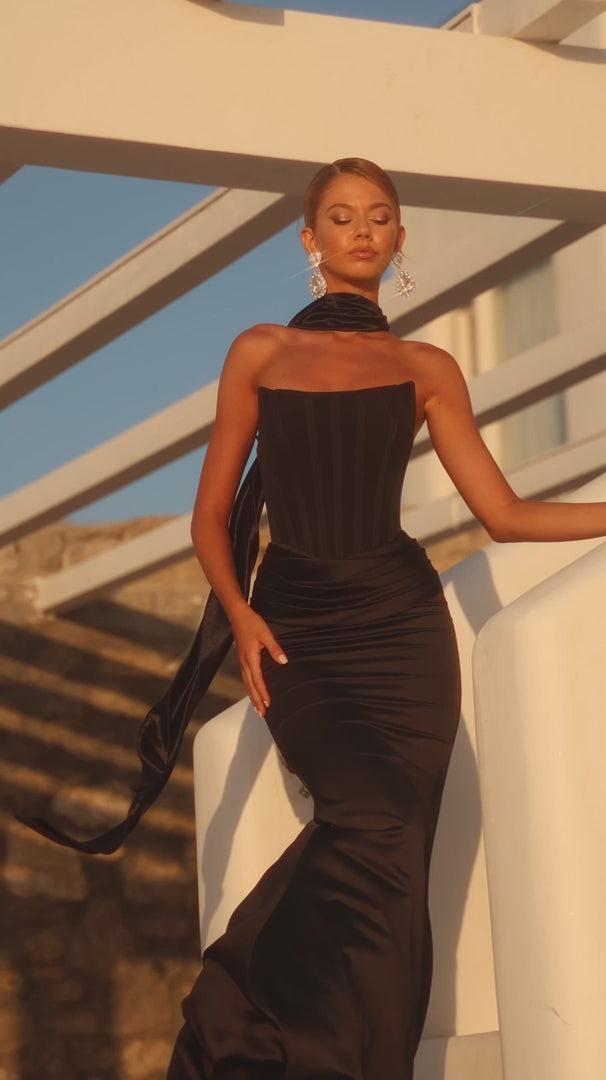 Style PS26032 embodies timeless sophistication with its minimalist design and impeccable tailoring. The strapless bodice features a structured, paneled construction that creates a refined architectural effect, subtly contouring the torso for a sculpted fit. Soft pleating at the waist transitions seamlessly into a smooth satin skirt that skims the body before flaring gently at the hem, creating an elegant hourglass silhouette.?