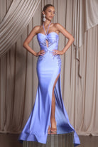 XO016 is a captivating satin gown designed to command attention. The structured sweetheart bodice features intricate lace applique detailing and a halter neckline that transitions into a daring keyhole cutout. The fitted silhouette hugs the body before flowing into a soft mermaid hem with a high side slit for added allure. Finished with delicate embellishments that glisten under the light, this gown perfectly balances sophistication and seduction.