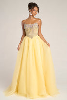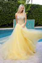 XO047 features a strapless fitted bodice detailed with crystal embellishments and exposed boning for a structured look. The tulle skirt flows softly from the waist, creating volume and movement. A lace-up back completes the design, adding both comfort and adjustability. Perfect for formal and red-carpet occasions.