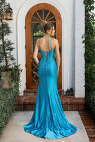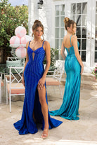 XO070 features a fitted silhouette with a structured bodice, thin straps, and a front cut-out detail. The fabric is accented with vertical beaded embellishments that elongate the figure. A thigh-high slit and lace-up back complete the look, creating a sleek and elegant finish.