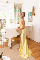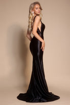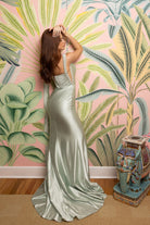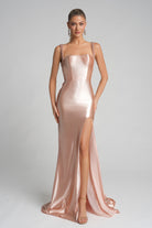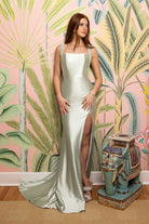 XO074 features a square neckline with wide embellished straps and a fitted satin silhouette. The sleek design includes a thigh-high slit and soft train, creating a timeless, elegant look. Perfect for formal events or evening occasions.