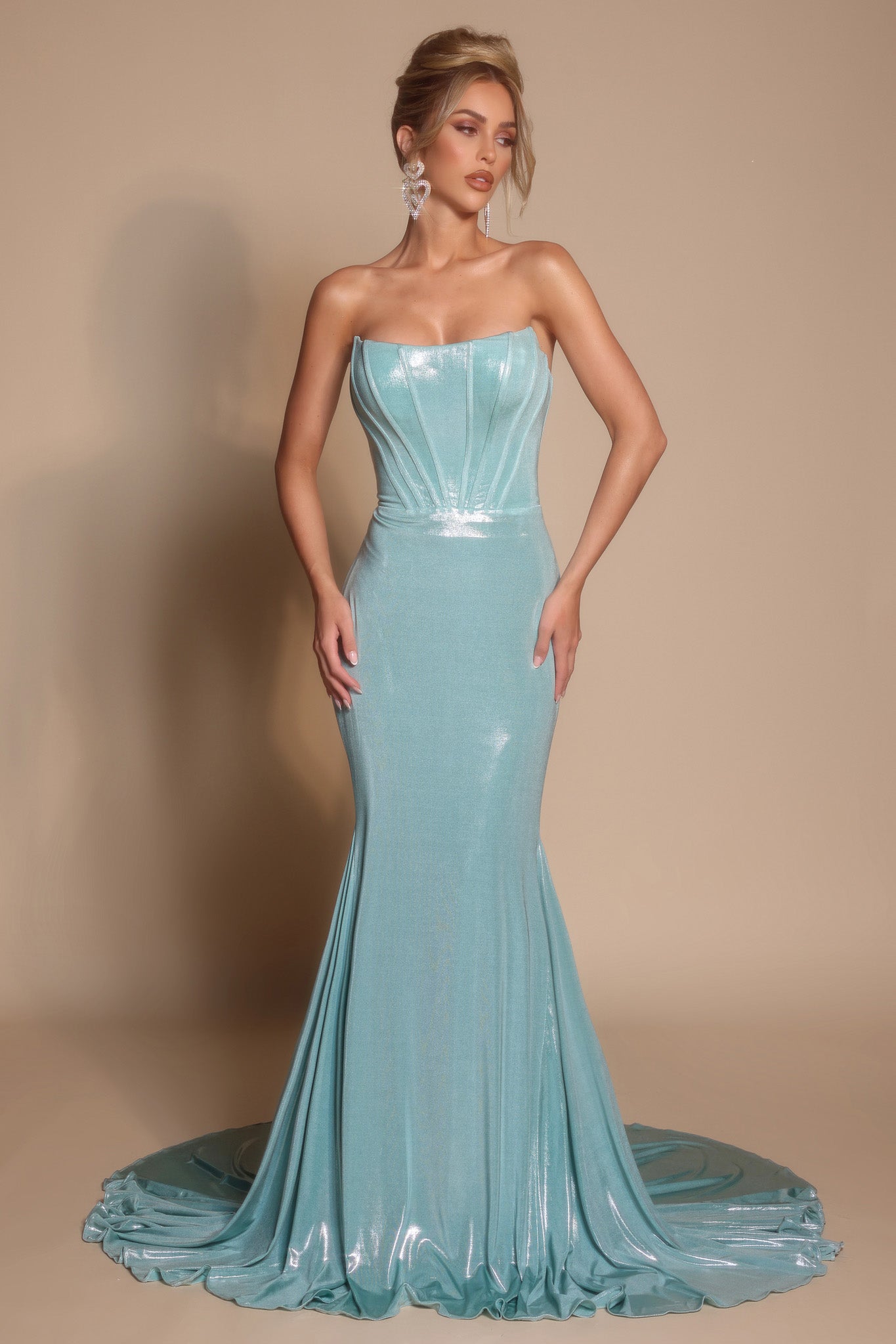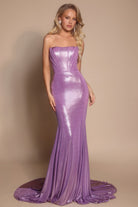 XO097 features a strapless fitted silhouette with a structured bodice and exposed seam detailing. Crafted from stretch shimmer fabric, it hugs the figure before flowing into a soft train. A simple yet striking gown designed for a smooth, polished look.
