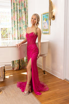XO156 is a show-stopping gown designed to turn heads. Featuring a strapless, fitted silhouette, this gown is embellished with radiant linear beadwork that elongates the figure. The thigh-high slit adds the perfect touch of drama, while the structured bodice enhances the waist for a flattering fit. Available in multiple vibrant colors, this dress is ideal for prom, pageants, or any red-carpet moment.