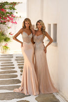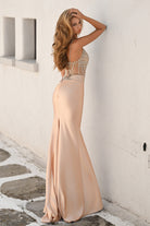 XO157 is a breathtaking gown that exudes glamour and allure. The fitted silhouette features a sheer, crystal-embellished bodice with delicate beading that cascades into a sleek, satin-finish skirt. The spaghetti straps and open back add a touch of sensuality, while the soft champagne tone enhances its elegance. Perfect for evening galas or red-carpet occasions, this dress captures both radiance and sophistication in every detail.