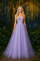 XO163 is a dreamy ballgown that captures fairytale elegance with a modern twist. The strapless structured bodice features a delicate sweetheart neckline and sheer corset detailing adorned with shimmering embellishments that accentuate the waist. Flowing into a full glitter tulle skirt, the gown creates a soft and romantic silhouette that sparkles with every movement. Perfect for pageants, prom, or any grand occasion, this look embodies grace and timeless beauty.