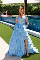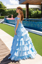 XO171 is a dreamy, feminine gown that radiates fairy tale charm. The off-the-shoulder bodice is adorned with intricate floral appliqu?s and delicate beading, perfectly complementing the layered tiered skirt that cascades gracefully to the floor. A subtle high-low hem adds a modern touch, revealing a glimpse of the legs while maintaining its voluminous, princess-like silhouette. With its soft pastel hue and romantic details, this gown captures the essence of timeless elegance.