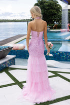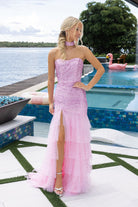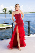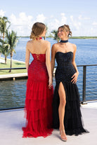XO173 is a sophisticated layered gown with a touch of sparkle. The structured strapless bodice features a flattering neckline and fitted shape that transitions into a tiered tulle skirt. Each layer is lightly embellished, giving the dress subtle texture and shine. A thigh-high slit and matching neckpiece complete the look with understated glamour.