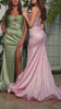 XO175 features a structured strapless design with sleek beaded detailing that accentuates the figure. The fitted silhouette includes a modern cut-out bodice and a thigh-high slit for a touch of edge. Finished with a subtle train, this gown offers a refined yet contemporary look for any formal occasion.