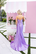 XO190 is a sleek two-piece gown that combines elegance with a contemporary edge. The structured corset top features pleated satin detailing, a crystal-trimmed neckline, and a small jeweled accent for added glamour. Paired with a fitted skirt that showcases a thigh-high slit and a graceful satin train, this set exudes confidence and sophistication. The lace-up back and matching satin scarf complete the look with refined balance and modern flair.