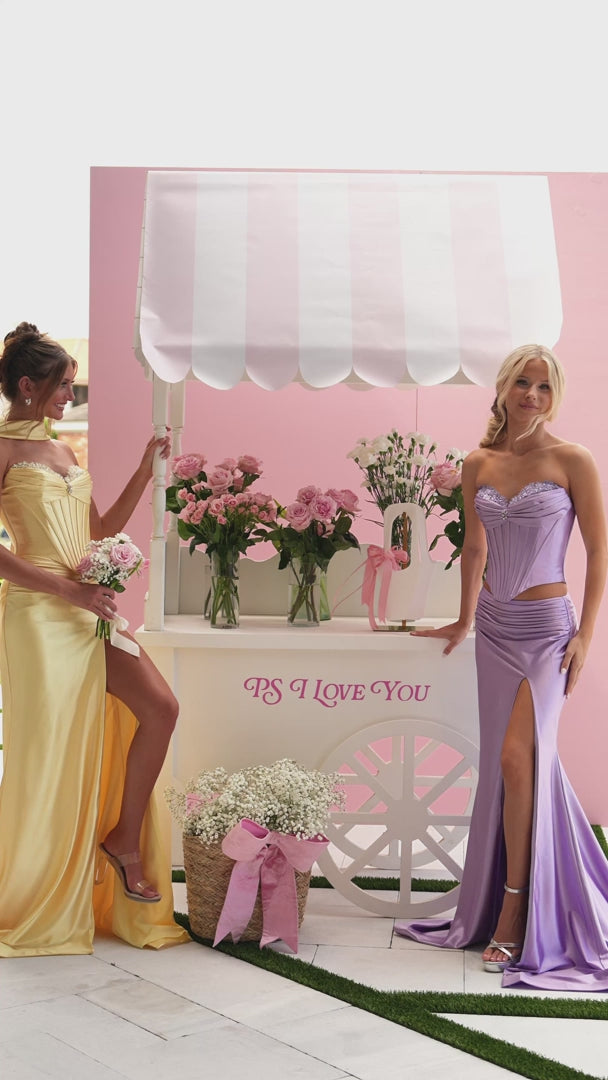 XO190 is a sleek two-piece gown that combines elegance with a contemporary edge. The structured corset top features pleated satin detailing, a crystal-trimmed neckline, and a small jeweled accent for added glamour. Paired with a fitted skirt that showcases a thigh-high slit and a graceful satin train, this set exudes confidence and sophistication. The lace-up back and matching satin scarf complete the look with refined balance and modern flair.