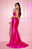 Strapless corset fitted gown with a keyhole and high slit. This dress has medium stretch.