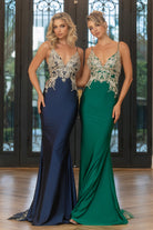 A V-neck gown with a low back, featuring lace detailing on the bodice and train. This dress has high stretch.