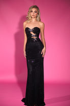 Strapless gown with 2 keyholes and designed with 3 crystallised bows for extra detailing. This is a floor length gown made of individually placed hot stone beads. This dress has high stretch.