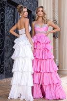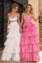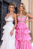 Two piece outfit with a ruffled skirt and a strapless crystal encrusted top. This outfit has no stretch.
