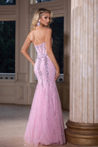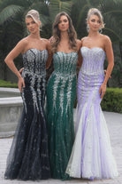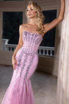 A strapless lace gown with flat crystals on the defined boned bodice and throughout the skirt. This dress has medium stretch.