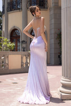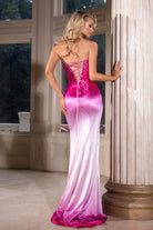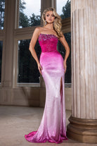 Strapless gown with a crystal encrusted bodice and a tie up back. The skirt has a high stretch and has individually placed hot stones.?