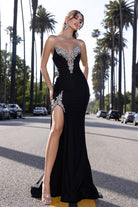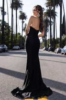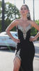 A strapless gown adorned with crystals along the trim of the bodice, cascading down into a V-shape, with additional crystal details around the top of the thigh slit. This dress has high stretch.