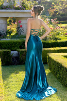 Strapless fitted gown with a beaded corset bodice, ruched skirt, and high slit. This dress has high stretch.