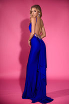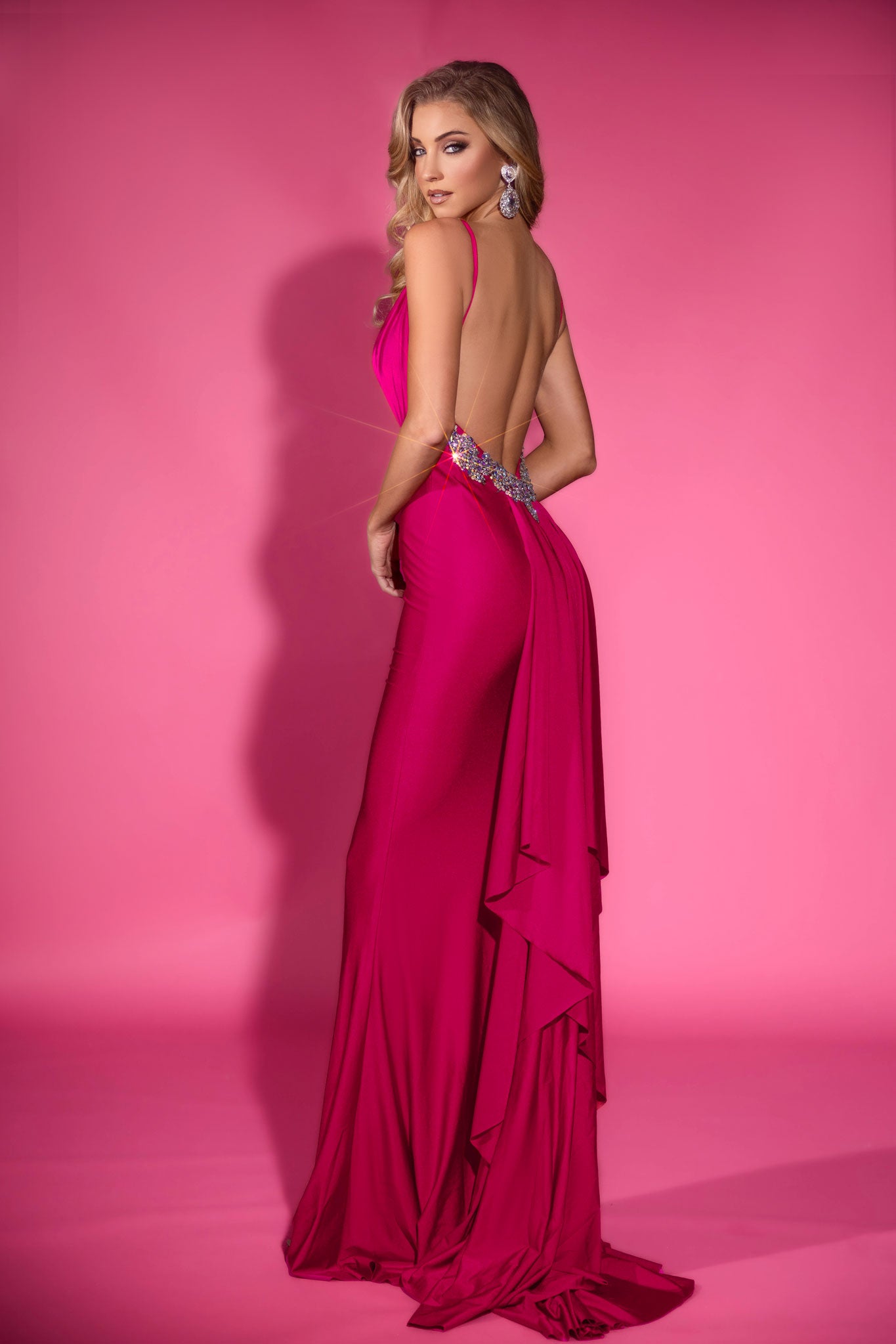 V-front stretch jersey gown, featuring a stunning low back adorned with crystals and a beautifully sewn-in back skirt. This dress has high stretch.