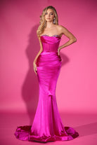 A strapless gown with rouging at the hips and a corseted bodice. This mermaid fitted gown features crystals on the bust and offers high stretch.