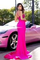 Halter neck dress with boning and a keyhole in the bodice. The waist is defined with rouging and this dress has a slit. This dress has high stretch.