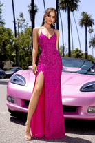 Fitted gown with a low back and a high slit. This dress has high stretch.